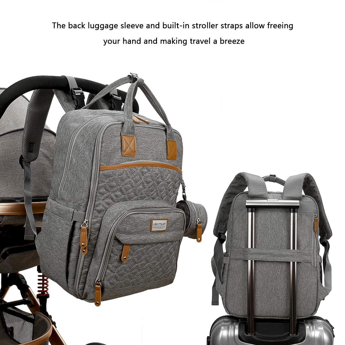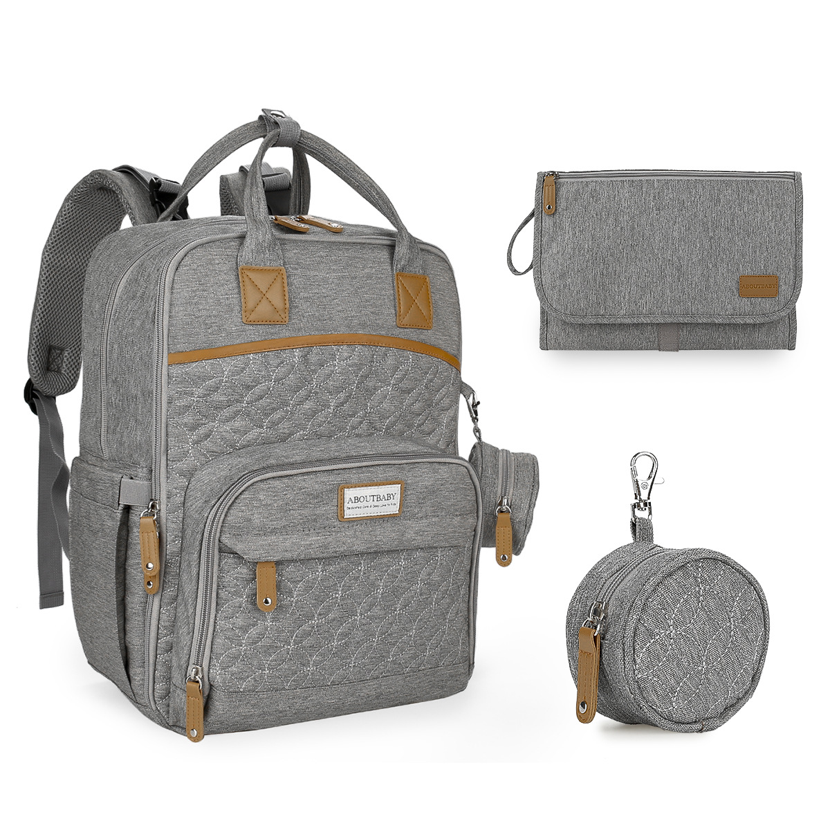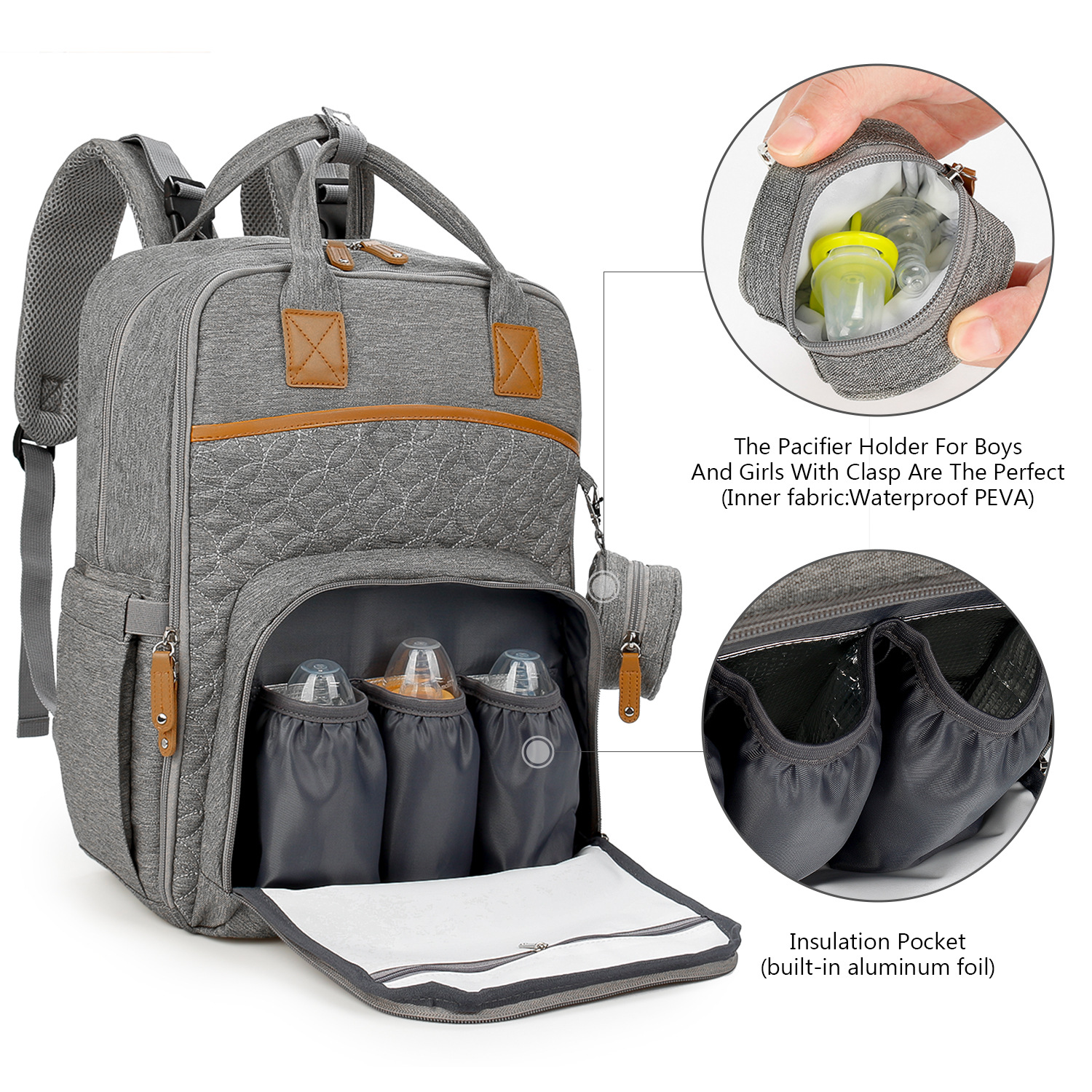 Дастаткова прасторны заплечнік для падгузнікаў (памер: 12"x8"x16,5", 26L), складны дыванок для пеленальных, які лёгка праціраецца (памер: 23"x14,5"), мае рамяні для калыскі і здымны трымальнік для пустышкі. Сумка для падгузнікаў пастаўляецца з усім, што вам трэба, калі вы знаходзіцеся ў дарозе, каб змясціць усё для дзіцяці, а таксама для вас.
