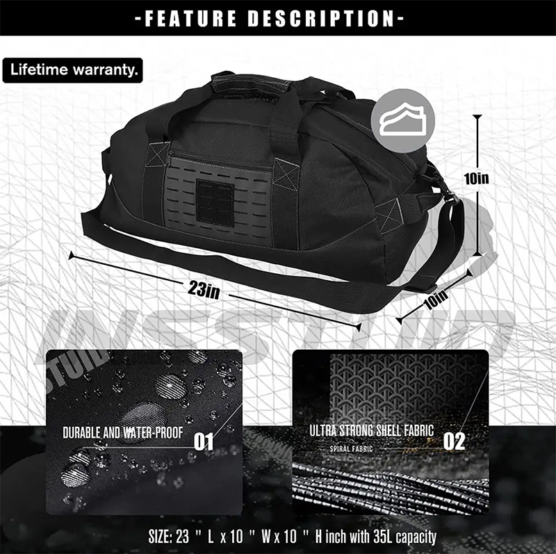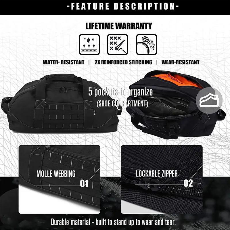 * [Robuste und wasserabweisende Sporttasche] Die Sporttasche verfügt über ein ultrastarkes Außenmaterial und besteht aus 600D Nylon Cordura für lang anhaltende Leistung. Die Außenhülle ist robust und wasserabweisend und mit verstärkten Nylonfäden vernäht.