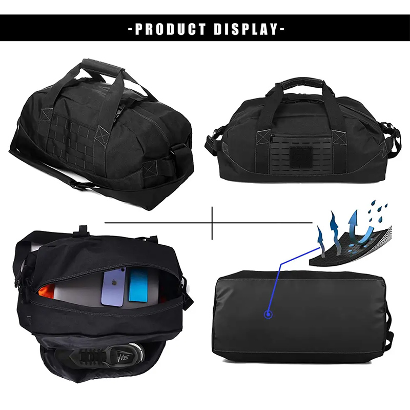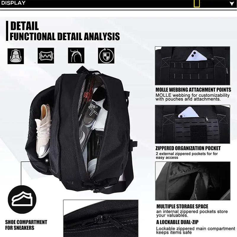 [Taktische Reisetasche mit Schuhfach] Die Sporttasche bietet ein abschließbares Hauptfach mit Doppelreißverschluss (Schloss nicht im Lieferumfang enthalten), das sicheren Stauraum für trockene und saubere Kleidung oder alles bietet, was Sie für das Fitnessstudio und auf Reisen benötigen. Ein separates Fach mit Reißverschluss