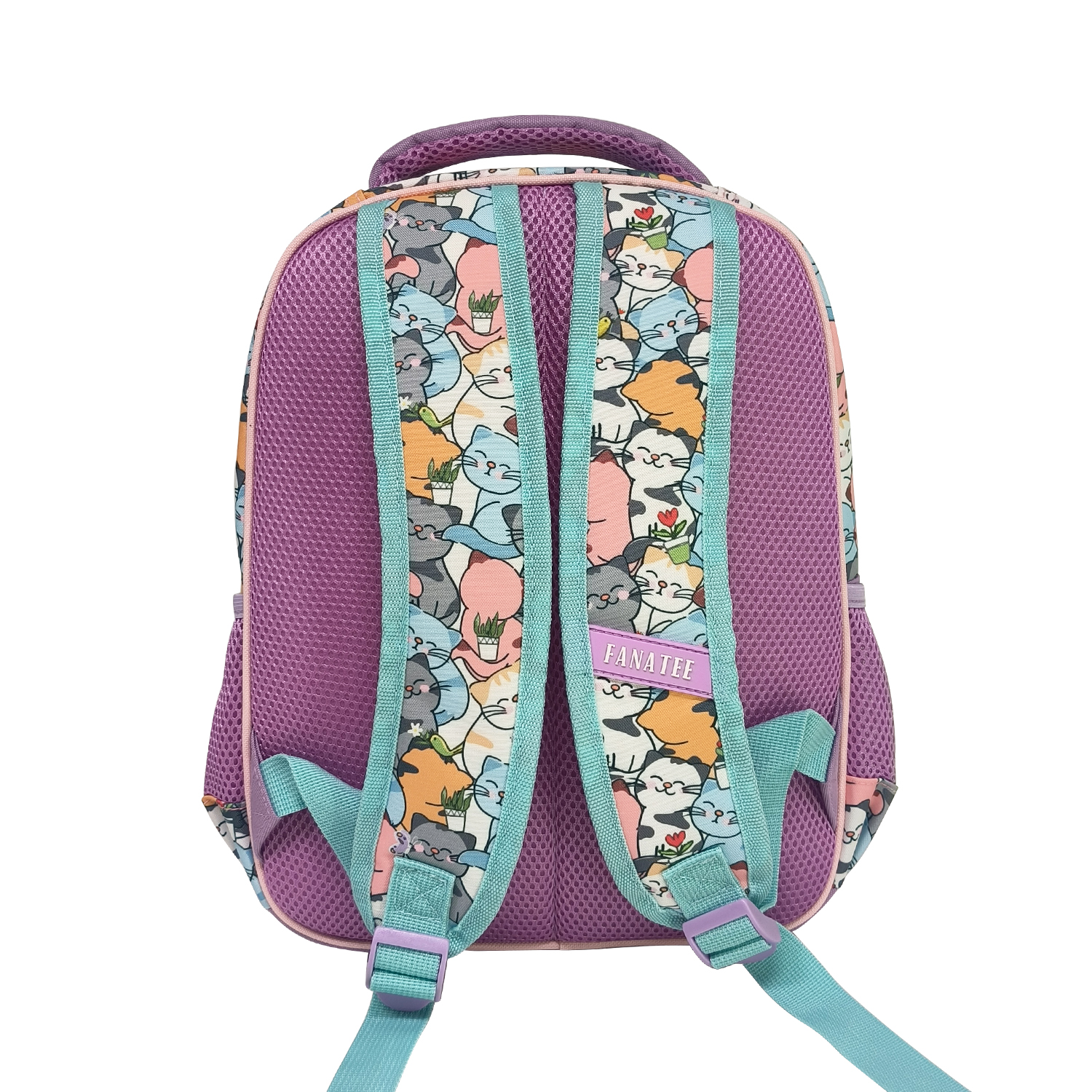 Αυτή είναι μια παιδική σχολική τσάντα. Κυριαρχείται από απαλές αποχρώσεις όπως το ροζ και το μοβ, και διαθέτει ένα αξιολάτρευτο ροζ σχέδιο γάτας στο μπροστινό μέρος. Στολισμένη με πούλιες και μικρά διακοσμητικά, έχει ένα παιχνιδιάρικο και ζωηρό στυλ, κατάλληλο για μαθητές δημοτικού. Όντας αισθητικά ευχάριστη και πρακτική, μπορεί να καλύψει τις καθημερινές ανάγκες των παιδιών για αποθήκευση βιβλίων και άλλων αντικειμένων όταν πηγαίνουν στο σχολείο.