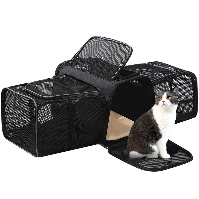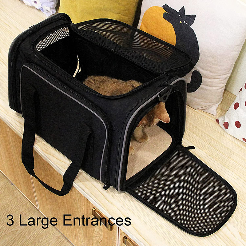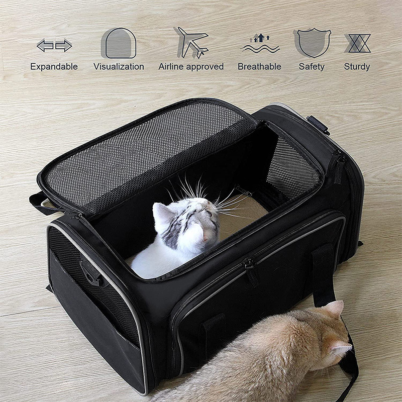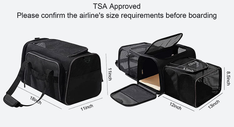 Η εγκεκριμένη εταιρεία μεταφοράς κατοικίδιων από την TSA πληροί τις απαιτήσεις μεγέθους των περισσότερων αεροπορικών εταιρειών για χειραποσκευές για ευκολότερη εμπειρία check-in στο αεροδρόμιο. επιτρέπει στους μεταφορείς κατοικίδιων να συγκρατούνται και με ζώνες ασφαλείας οχημάτων. Διαθέτει ιμάντες μεταφοράς χεριών και ρυθμιζόμενο λουράκι ώμου με επένδυση για ευκολία.