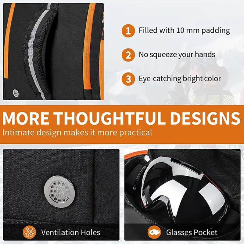 2.Keep Your Gear Organized: Η κύρια θήκη μπορεί να χωρέσει οποιοδήποτε μέγεθος παπουτσιών και κράνους. Οι μεγάλες τσέπες και στις δύο πλευρές μπορούν να αποθηκεύσουν σακάκια, γάντια, πετσέτες. Οι τσέπες με πλέγμα και φερμουάρ είναι βολικές για πορτοφόλια, κινητά τηλέφωνα, κλειδιά, σνακ και άλλο εξοπλισμό. Οι τσέπες από ίνες φανέλας σχεδιασμένες για γυαλιά σκι, αποτρέπουν το γδάρσιμο της επιφάνειας του καθρέφτη.