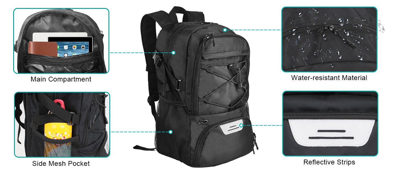 Granda stoka kapacito: Kun granda ĉefa stoka fako, estas poŝo por tekokomputilo kaj tabulkomputilo, ekstraj poŝoj por teni ŝlosilojn, poŝtelefonojn, monujojn, botelojn kaj aliajn havaĵojn. Du eksteraj poŝoj por teni botelojn, kaj etendebla ŝnuro por teni la ĉapon.
