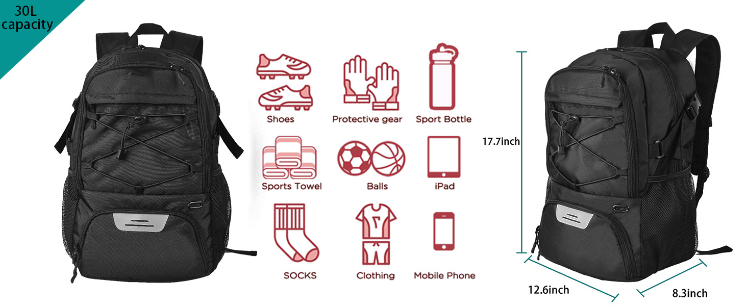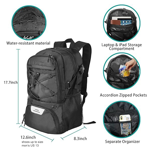 La basketbala dorsosako Wolt estas la ideala grandeco por plenkreskaj, junaj adoleskaj ludantoj. Vasta ĉefa fako kun poŝo por tekkomputilo/iPad, internaj flankaj poŝoj por valoraĵoj kiel poŝtelefono, monujo, ŝlosiloj, ktp. Aparta pilkofako por basketbalo, futbalo, futbalo aŭ flugpilko.