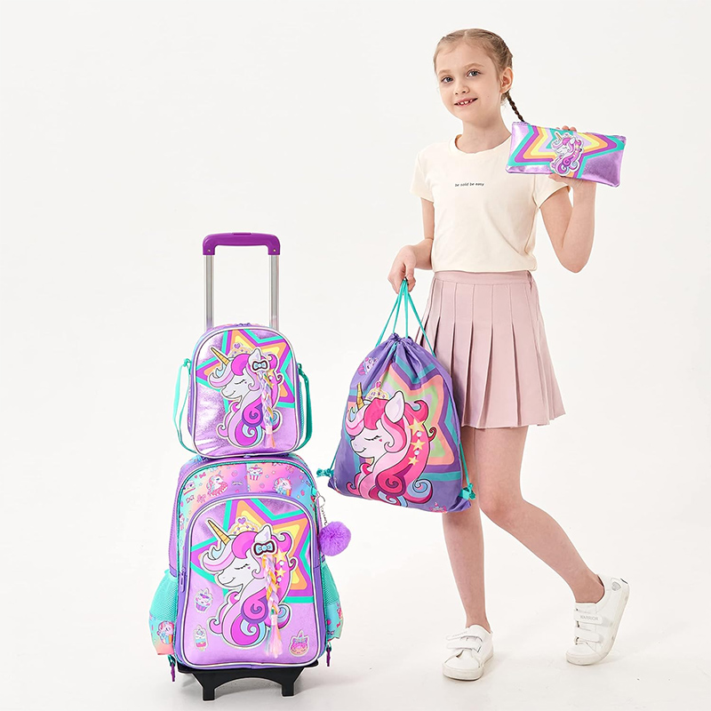 5 en 1 Rulanta Tornistro por Knabinoj: Vi ricevos 1 Forprenebla Rulanta dorsosako, 1 Ŝnura Sako, 1 Lunĉujo, 1 Krajonujo kaj 1 Puffy pilko.