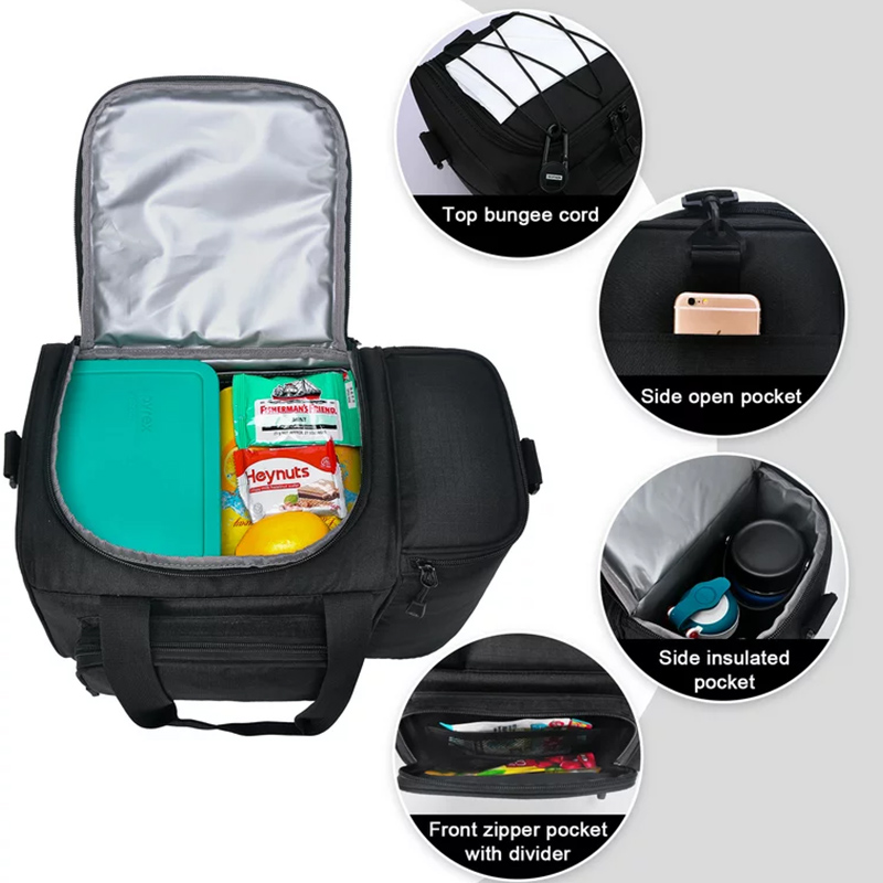 Granda kaj Organizita Lunĉujo---- ; Kun 2 izolita stokejo, 1 antaŭa zippa poŝo kaj 1 flanka poŝo por io, kion vi bezonas facile alirebla.