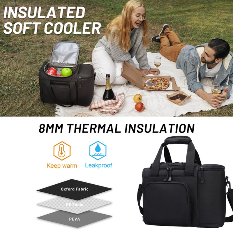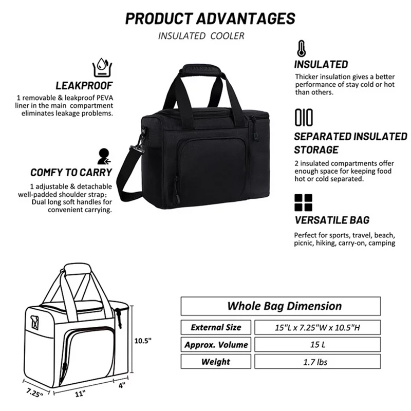 Apartigita Izolita Lunĉsako ---- Huafang-granda malvarmeta sako havas 2 izolitajn kupeojn, ĉefa "malvarma" kupeo (interna dimensio: 9.8"L * 7"W * 9.8"H) havas 24-ladskatolon, sufiĉe ampleksan por paki vian. manĝo, malvarmigantaj trinkaĵoj, suko kaj tiel plu; 1 flanka "seka" kupeo (interna dimensio: 3.5"L * 7"W * 9.8"H) perfekta por ne-likaj aĵoj, kiel fruktoj, manĝeto, ktp.