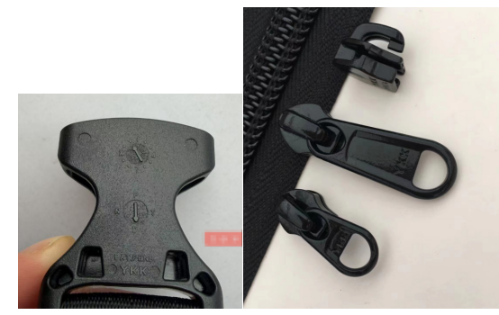 Fermetures éclair, boucles, sangles, filet, mousse, doublure, curseurs, logos métalliques