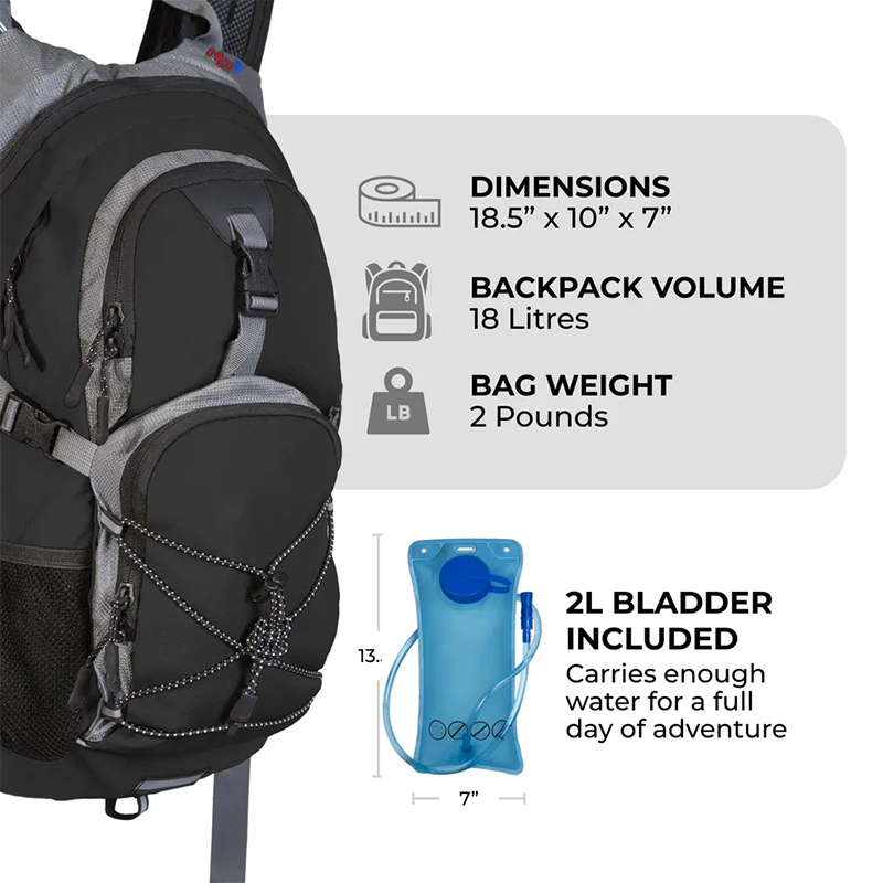 ハイキング、マウンテンバイク、ウィンタースポーツに最適な、2 リットルのウォーターブラダーが無料で付属する 18 リットルのハイドレーション パック。