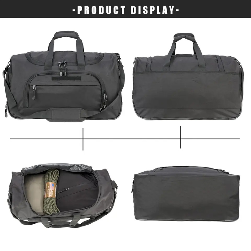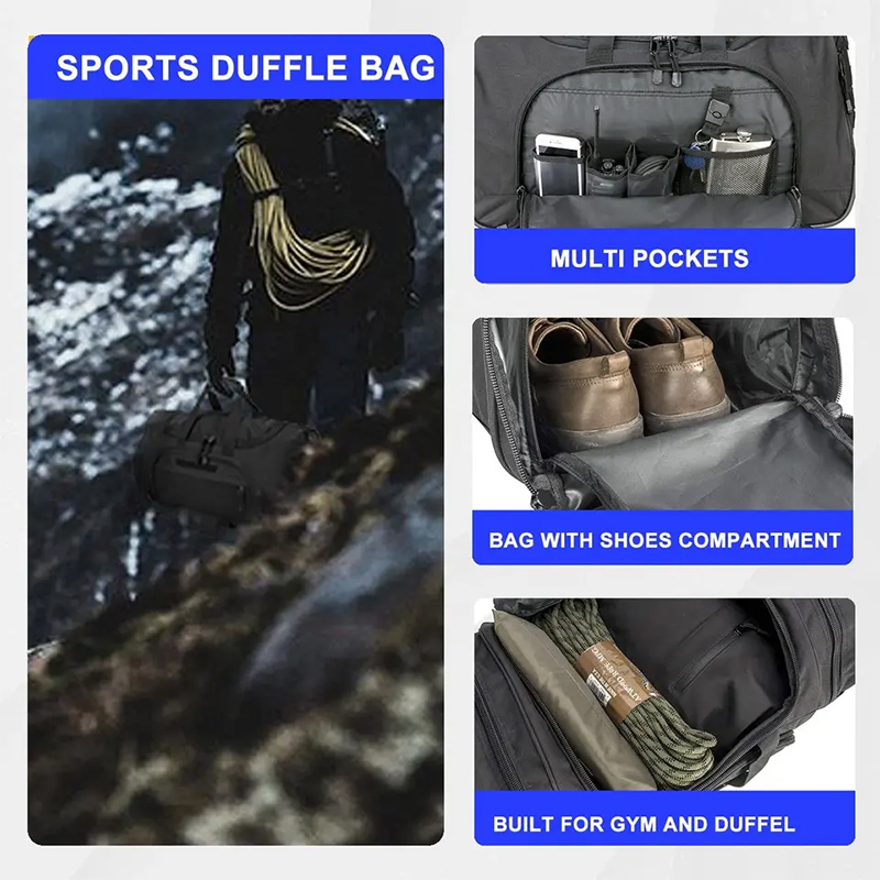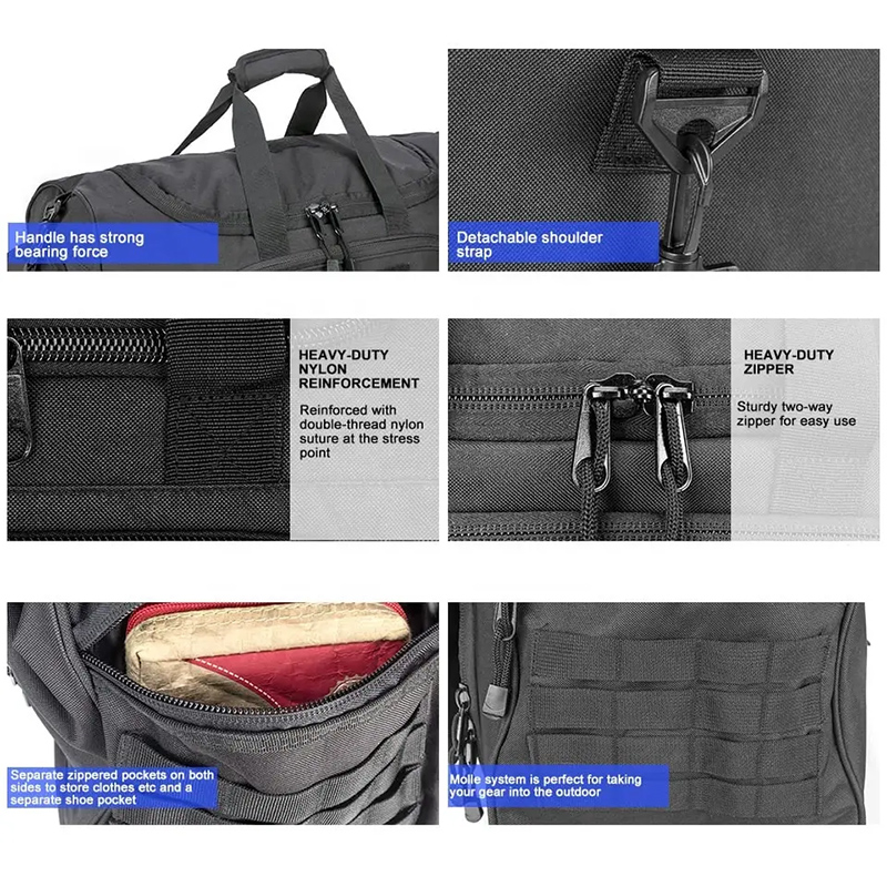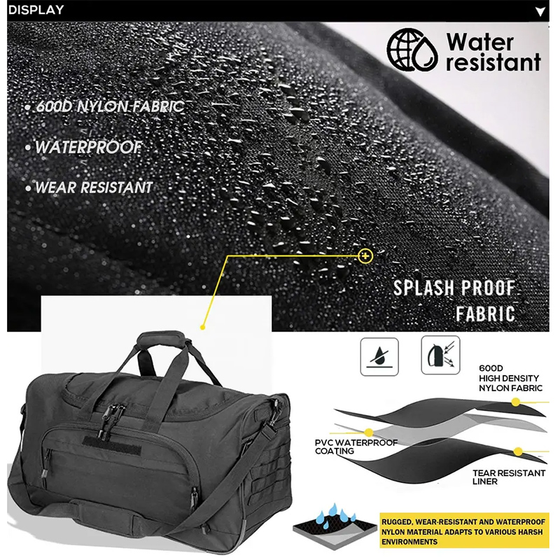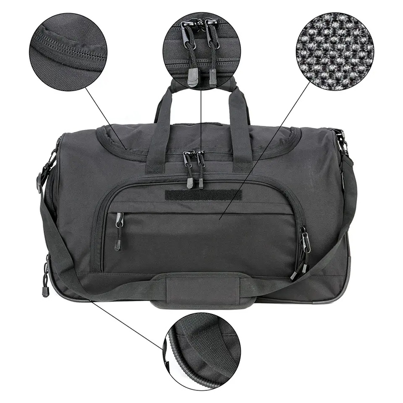 튼튼한 자가복구 지퍼; 강화된 손잡이; 조절 가능한 2인치 패딩 어깨 스트랩; 역방향 지퍼; 보관 가능 품목: 옷, 아이패드, 수건, 신발, 기타 스포츠/헬스 필수품; 키 카드, 휴대폰, 기타 소형 액세서리; 더러운 옷이나 부츠.