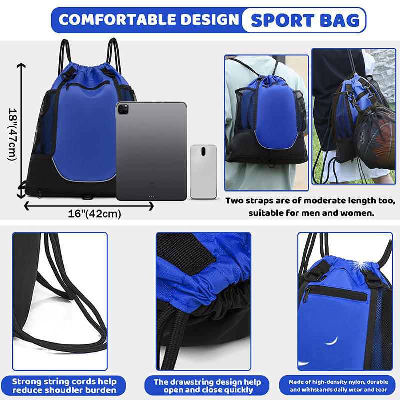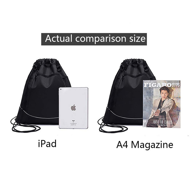 Ample storage space-Drawstring backpack includes a oversize main compartment with a small zippered pouch for wallet and cell phone, a medium zipper closure compartment , two shoe compartments, two mesh compartments and a card window