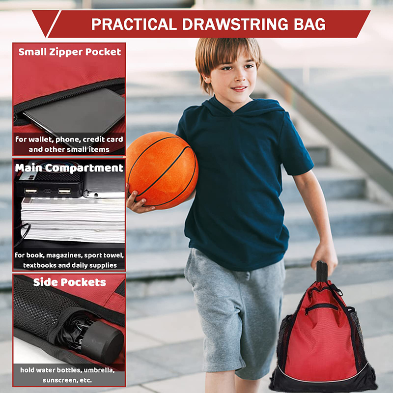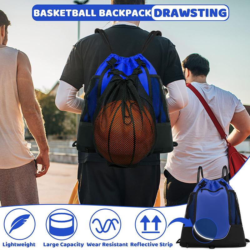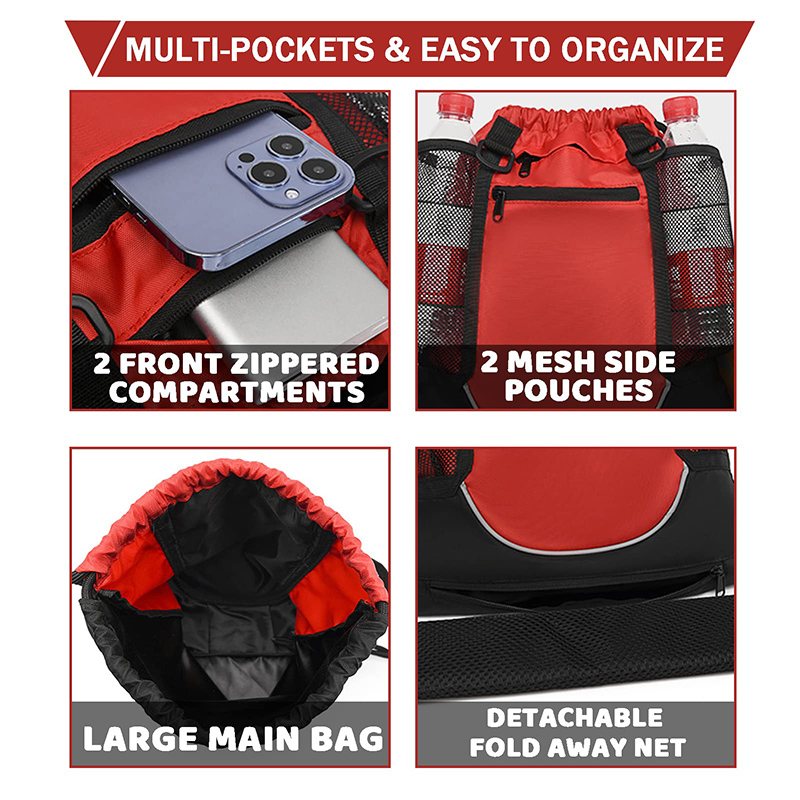 Basketball backpack design- A drawstring waterproof backpack. The mesh bag is attached to the backpack by 2 buttons. Note: The mesh bag is stored in the bottom zippered pocket.